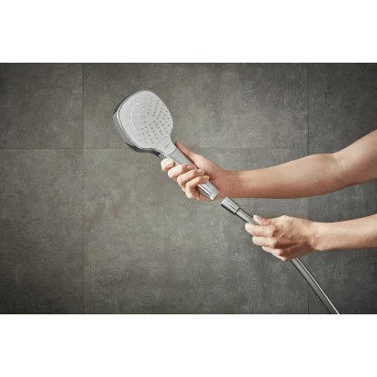 Beim Croma Select E Vario Duschkopf sind verschiedene Strahlarten möglich. Der Rain-Strahl sorgt für eine angenehme, großflächige Regendusche. Entspannend wirkt auch der starke und konzentrierte IntenseRain, der optimal Verspannungen im Schulter- und Nackenbereich löst. Erfrischung gefällig? – Mit dem TurboRain Strahl, einem intensiven Brauseregen kein Problem. Alle Strahlarten sind bei der Croma Select E Vario Handbrause einfach und variabel durch Knopfdruck (Select) wählbar.