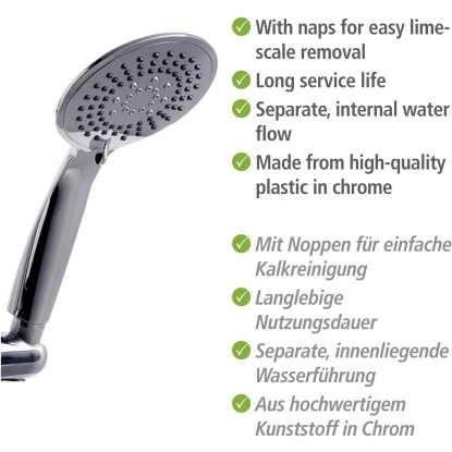 Entspannt gelingt auch die Reinigung des Duschkopfes mit Ø 11 cm aus ABS-Kunststoff. Seine Noppen ermöglichen eine einfache Reinigung. Kalkrückstände können mit den Fingern abgerieben werden. Die Handbrause verfügt über einen 1/2 Universalanschluss und ist für Durchlauferhitzer geeignet. Ergänzt wird die schicke, silberfarbene Kombination durch einen passenden Duschschlauch (150 cm) aus Edelstahl mit einem 1/2 Standardanschluss. Der Schlauch ist belastbar, dehnbar und knickfest. Mit dem Brauseset Young von Wenko zieht ein modernes wie elegantes Ensemble in klassischem, glänzenden Silber in Ihr Badezimmer ein, das für wahre Wohlfühlduschen sorgt.